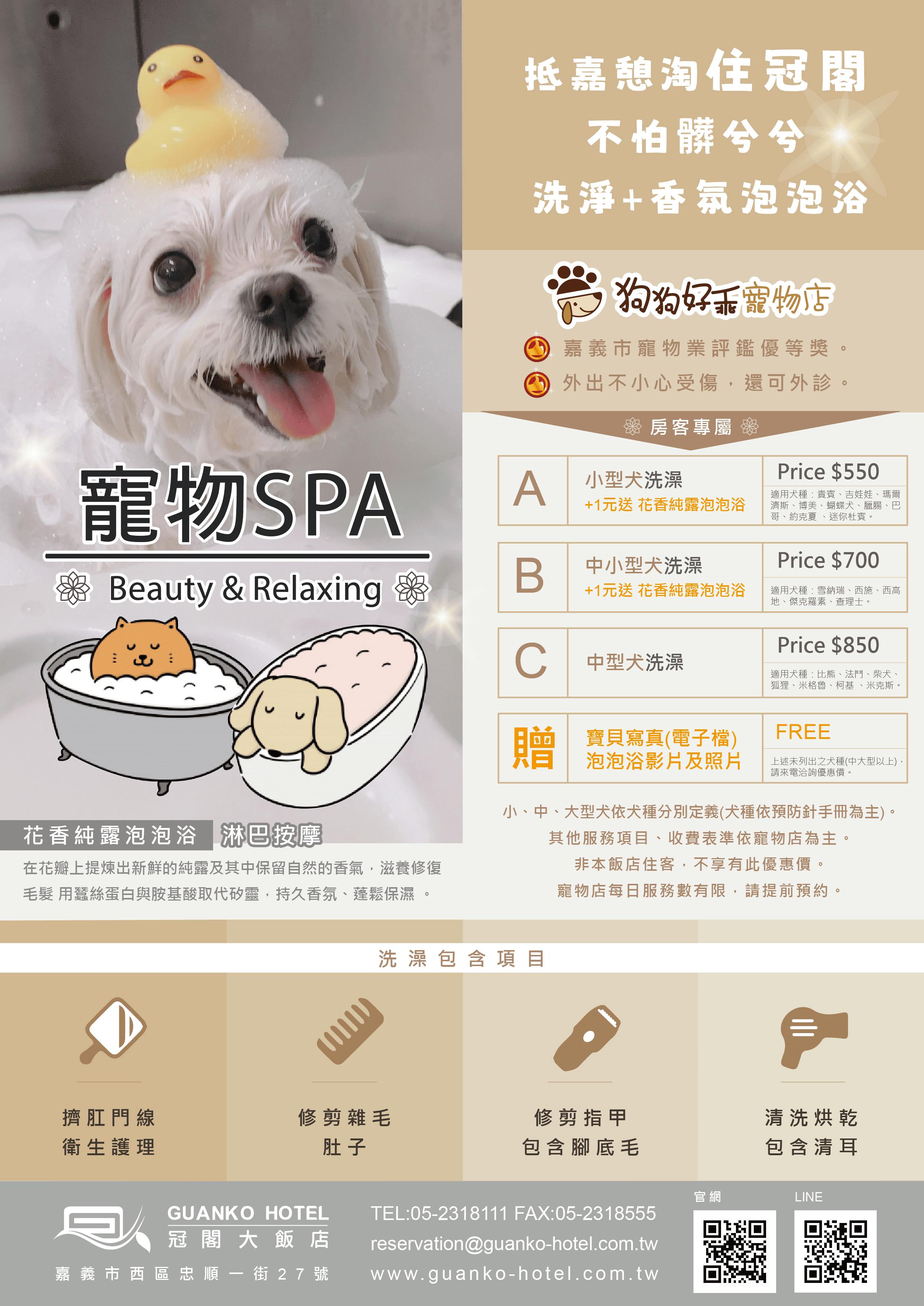 - 小型犬 (貴賓、吉娃娃、瑪爾濟斯、博美、蝴蝶犬、臘腸、巴哥、約克夏 、迷你杜賓),洗澡優惠價$550。